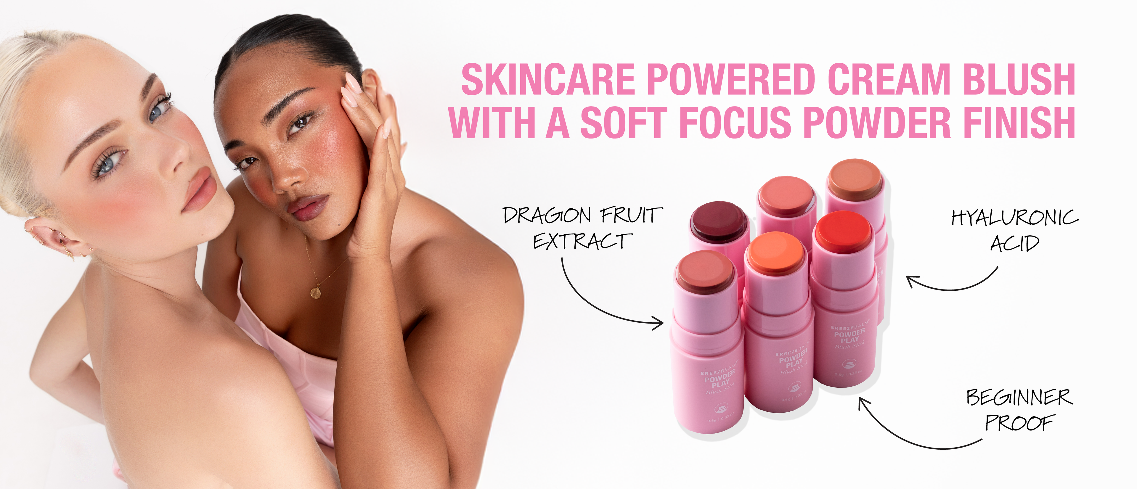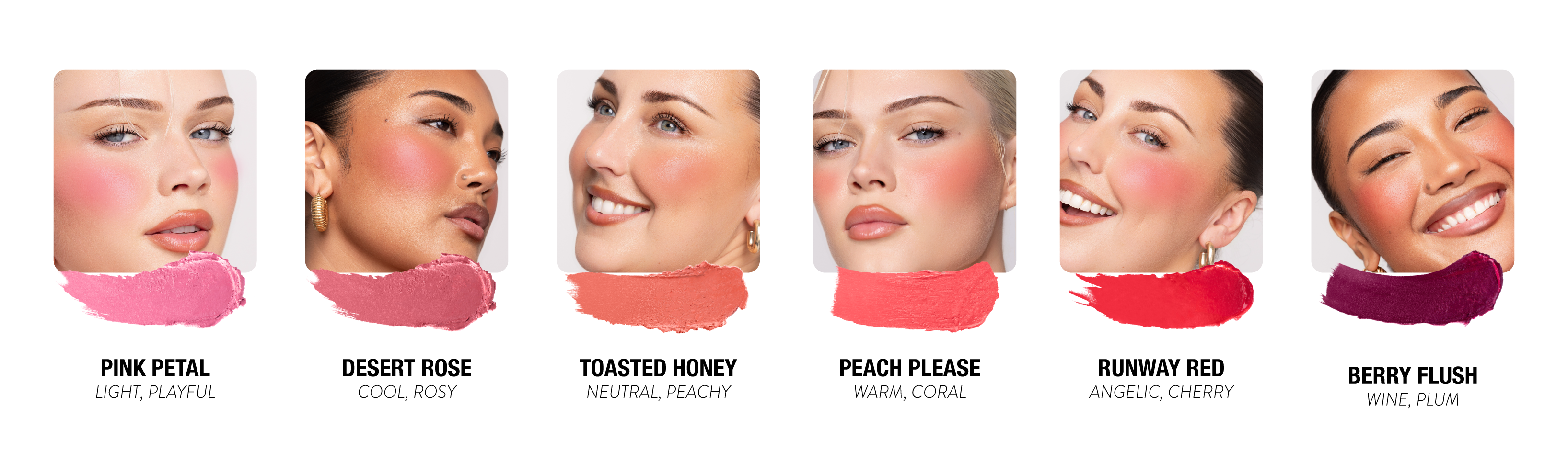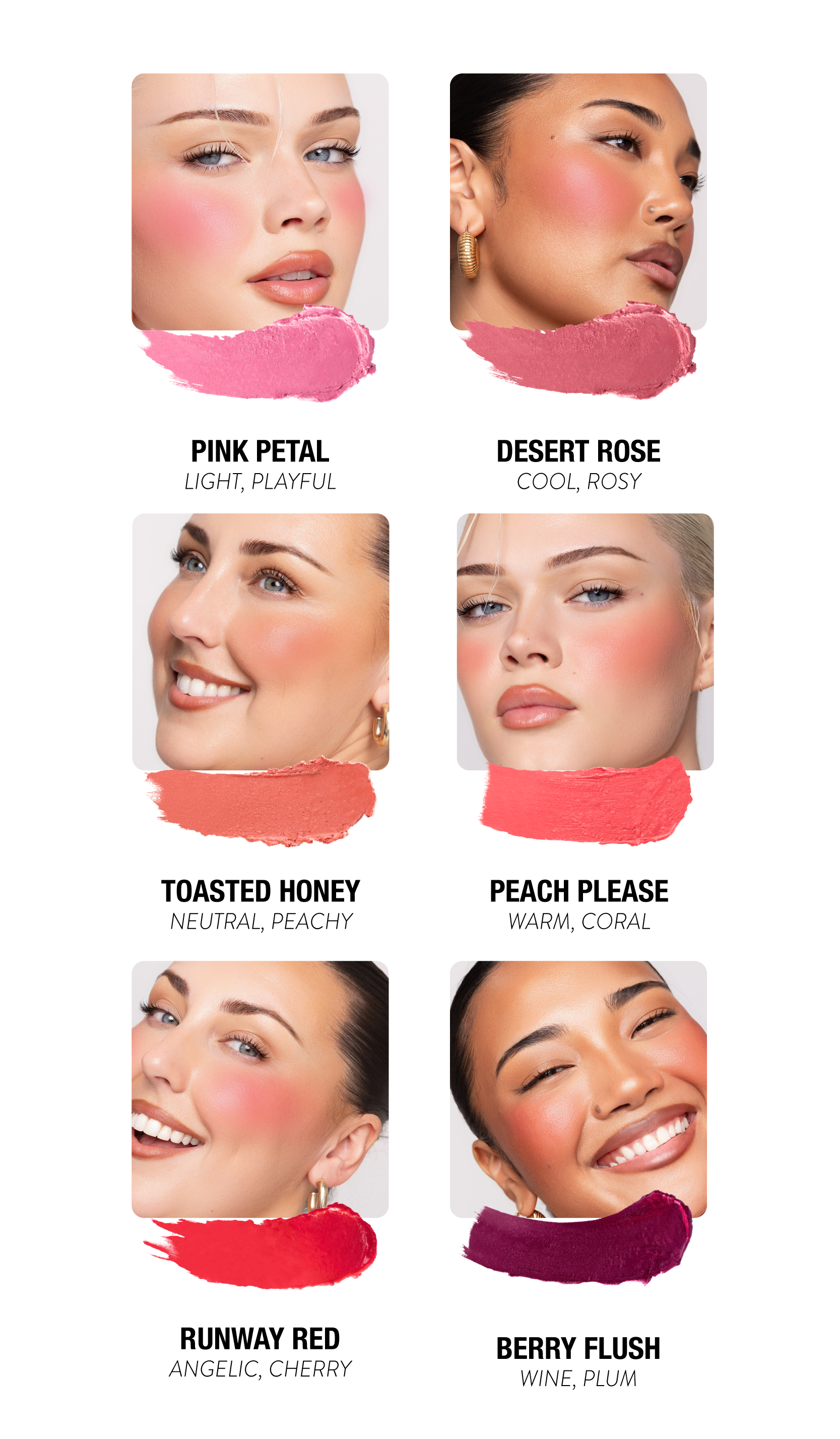 Our blush stick is a soft focus, cream-based formula in a portable, twist-up stick. Designed for seamless blending, high pigment payoff and natural skin like finish. Powder Blushes (loose or compact) can sometimes deliver less colour, crack during travel or sit on top of the skin making it look flat or cakey.