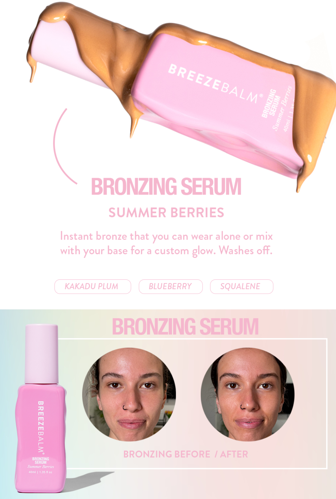 Get an Instant Bronze with our vitamin-rich Bronzing Serum. Infused with Kakadu Plum, Acai & Blueberry to brighten, plump, and even skin tone. Jojoba Oil and Squalene hydrate, smooth, and nourish.